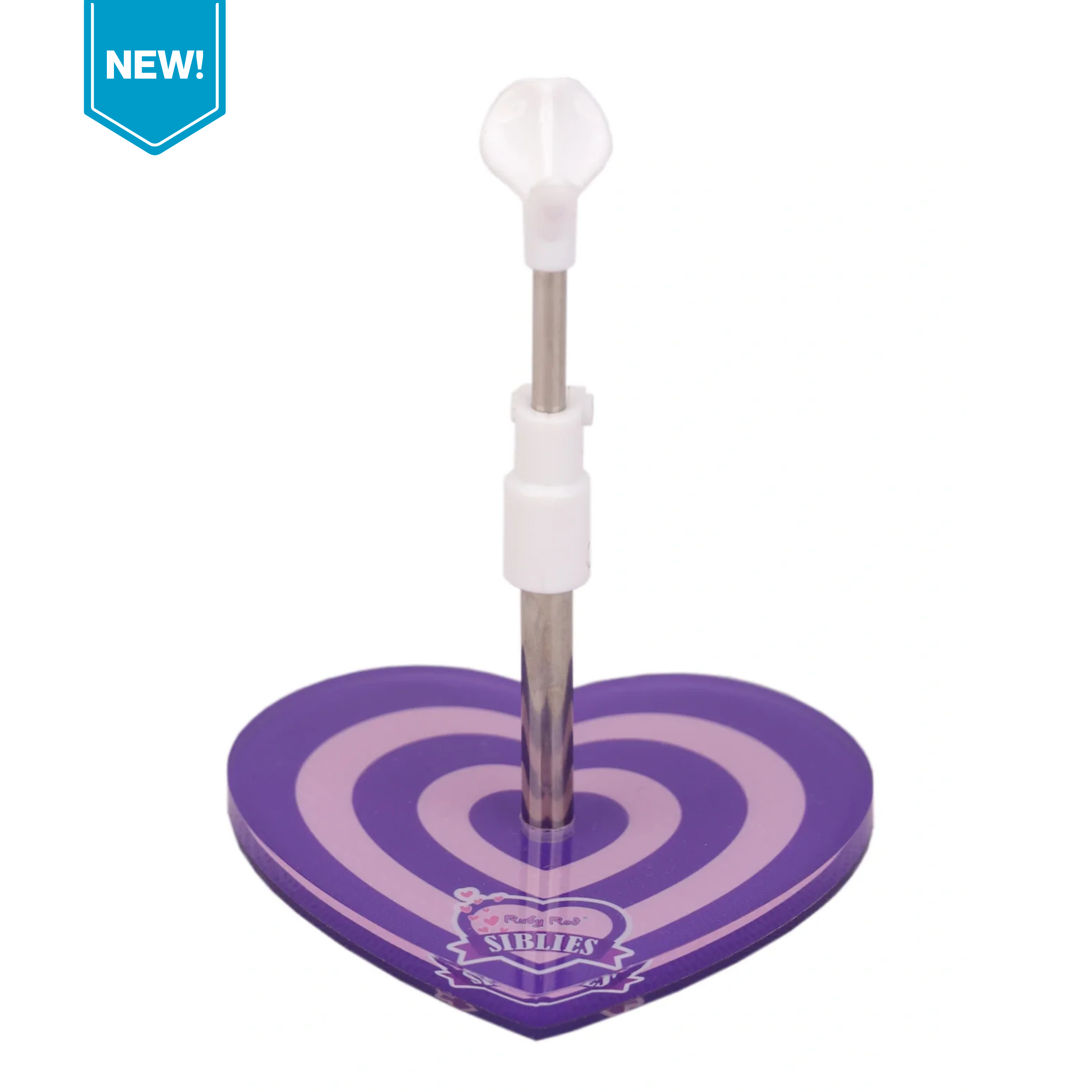 Featuring a sleek design, with an adjustable saddle seat and a heart-shaped acrylic base adorned with a beautifully designed graphic and the iconic Ruby Red Siblies logo.