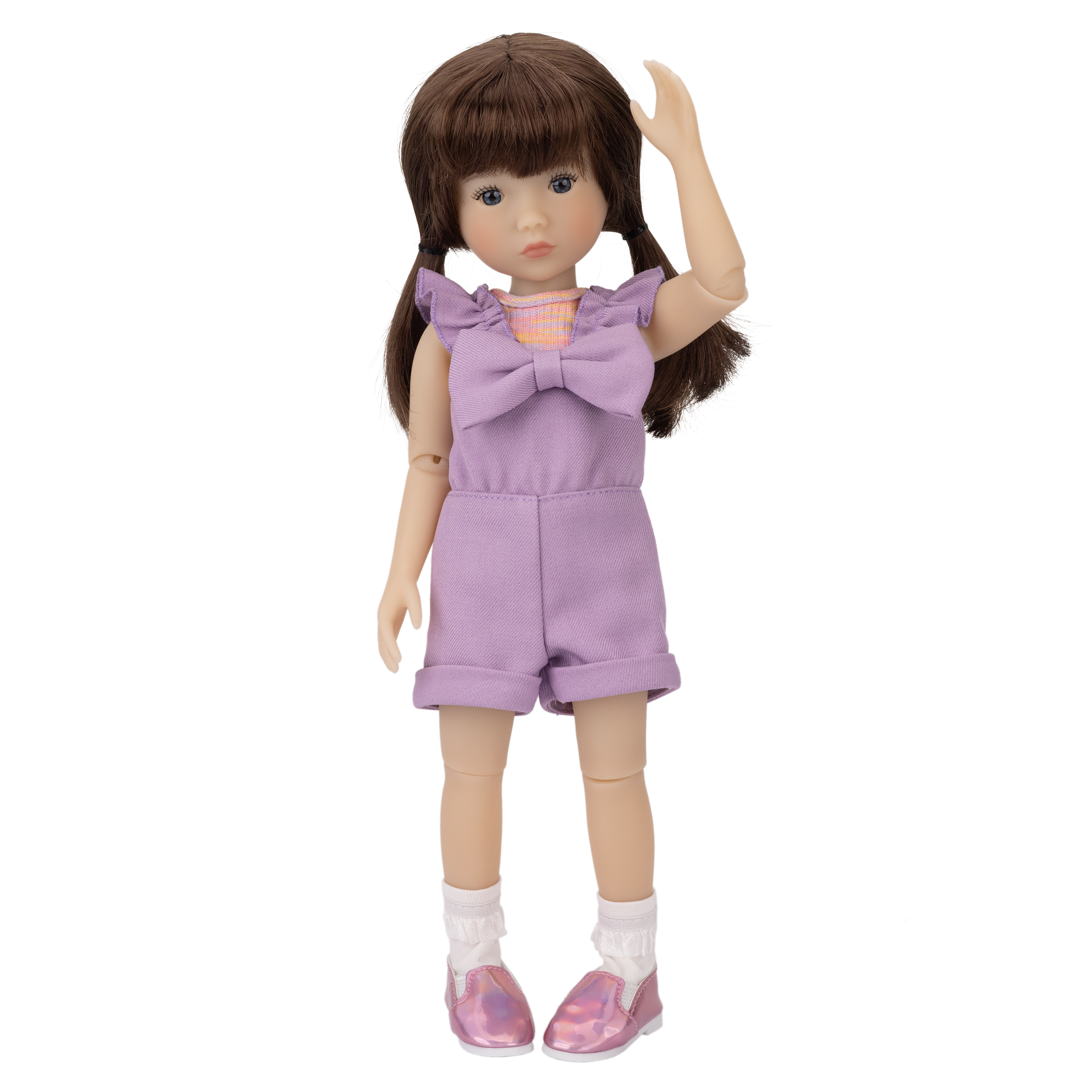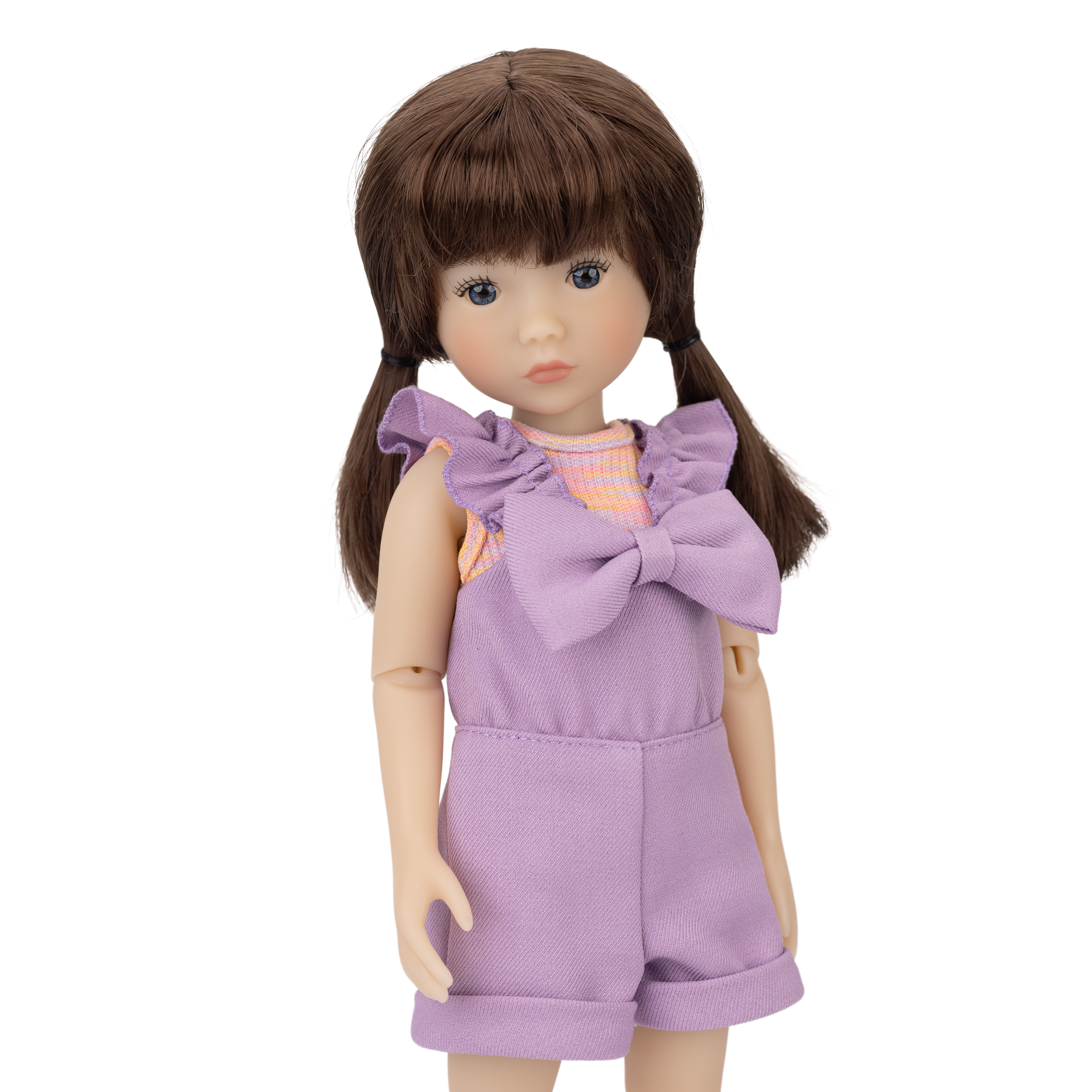 Tracy’s outfit is as whimsical as her artistic spirit! She’s wearing an adorable lavender romper with playful straps that feature delightful ruffled sleeve flounces. The shorts have rolled cuffs for an adorable touch, while a stunning purple bow takes center stage!