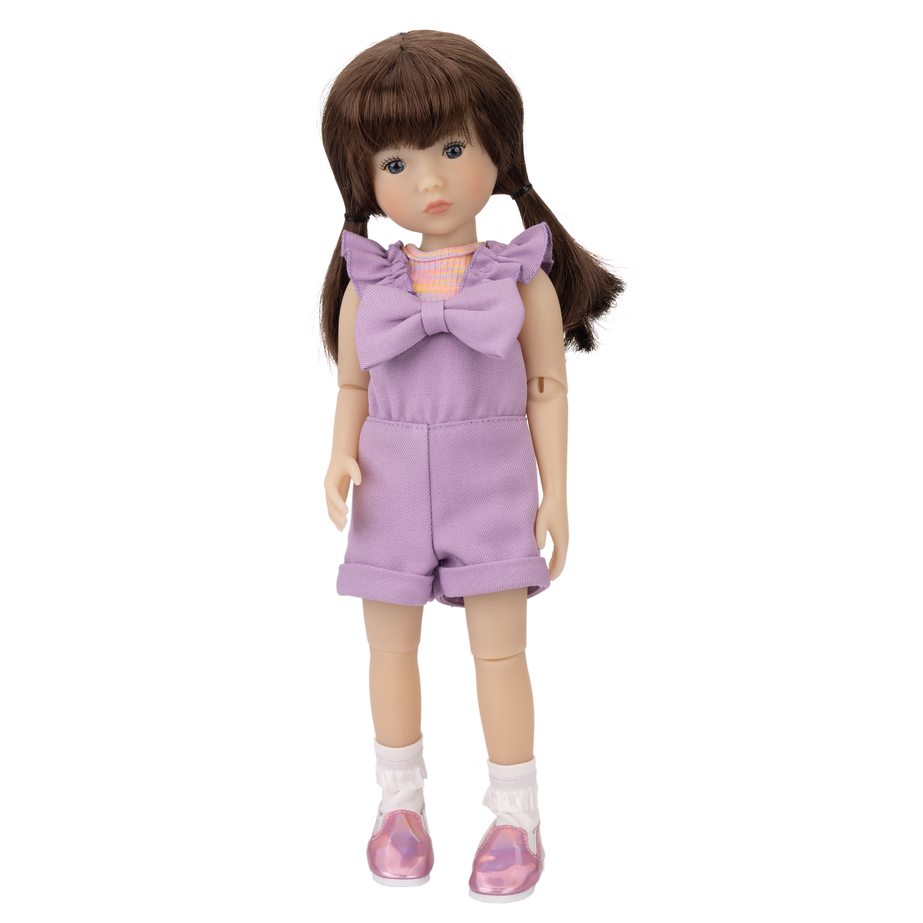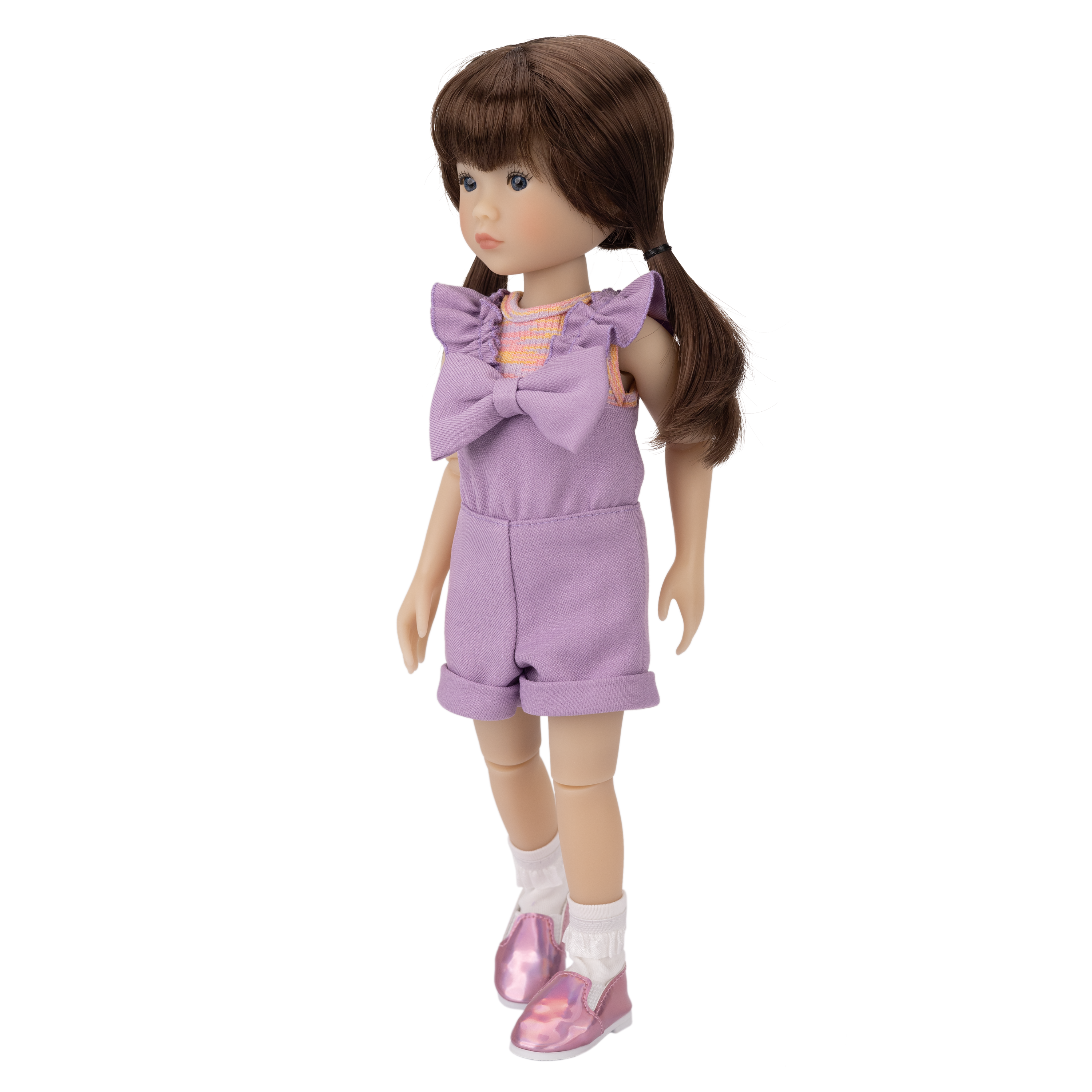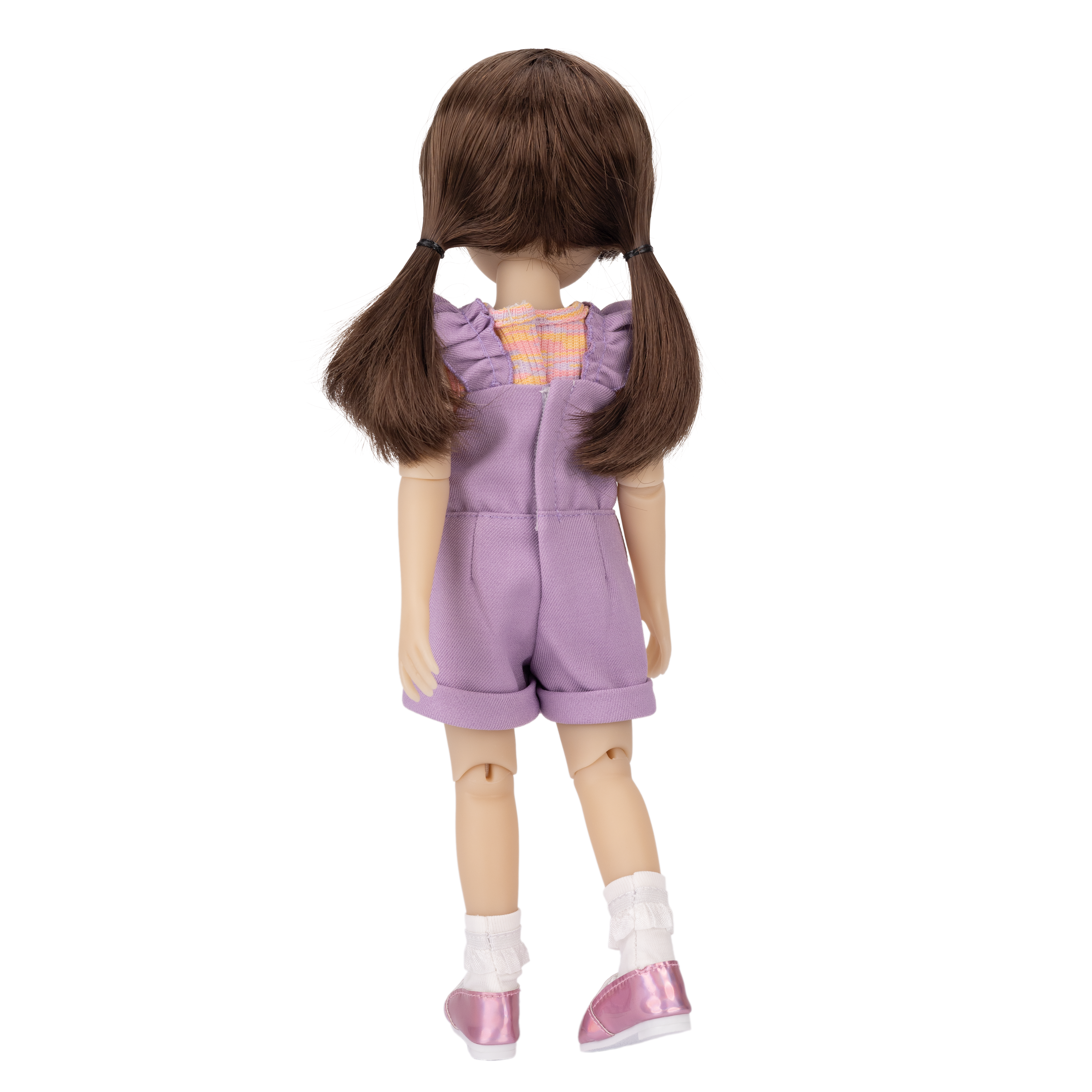 Tracy also comes wearing adorable socks featuring a ruffle trim. To finish off the ensemble, she has super cute shiny iridescent pink slip-on shoes that sparkle with every step!