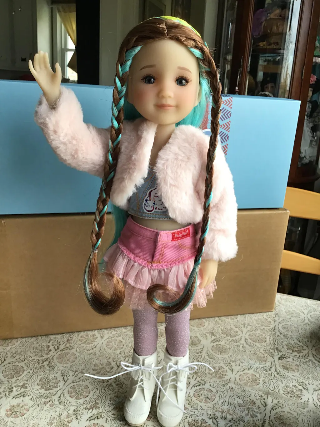She arrives wearing a denim corset top emblazoned with her signature phrase 'Live Your Truth', a pink denim skirt with tulle trim, and white fringed lace-up boots. Her accessories include a fluffy pink cropped jacket, a pair of dazzling glittery pantyhose, and a fabulous floral headband fit for any forest princess.