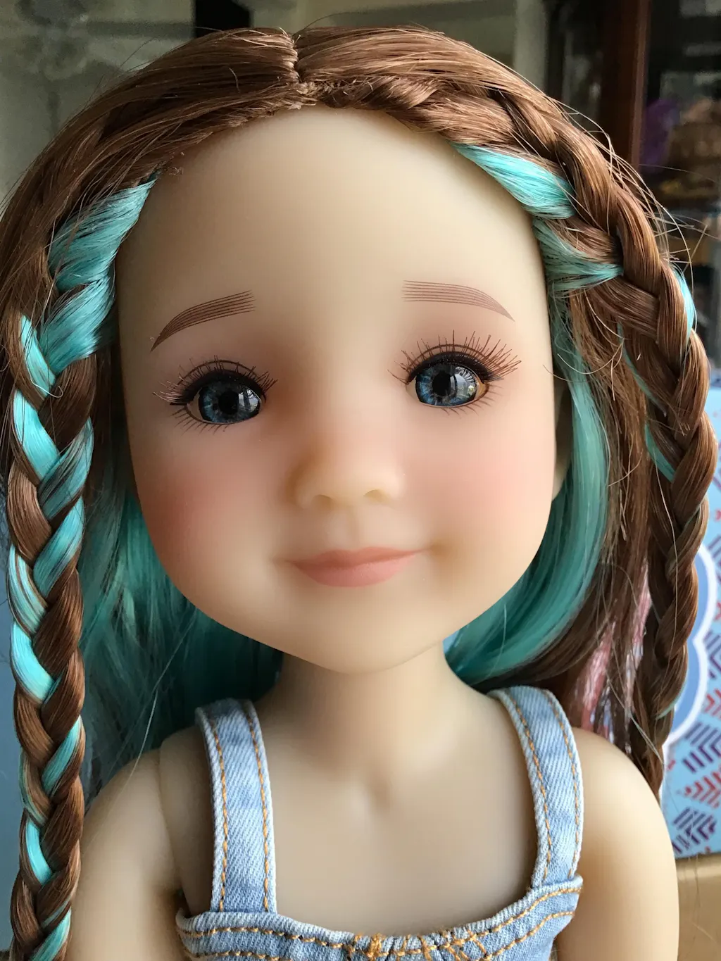 Live Your Truth Ella has large blue eyes, a serene smile, and flowing brunette hair with electric blue highlights.