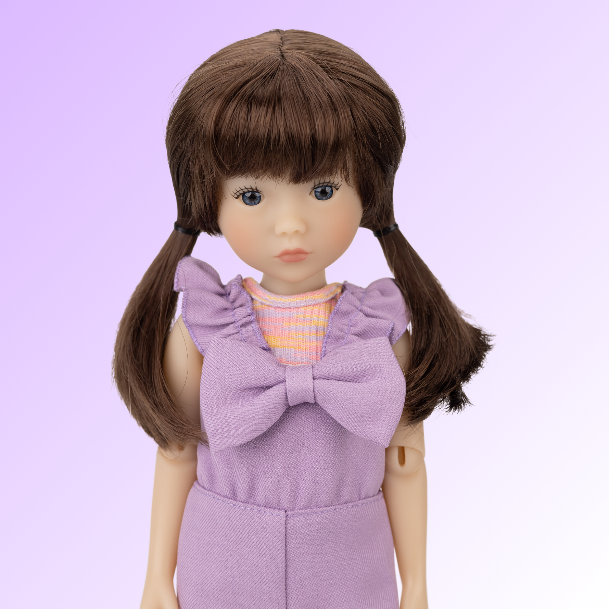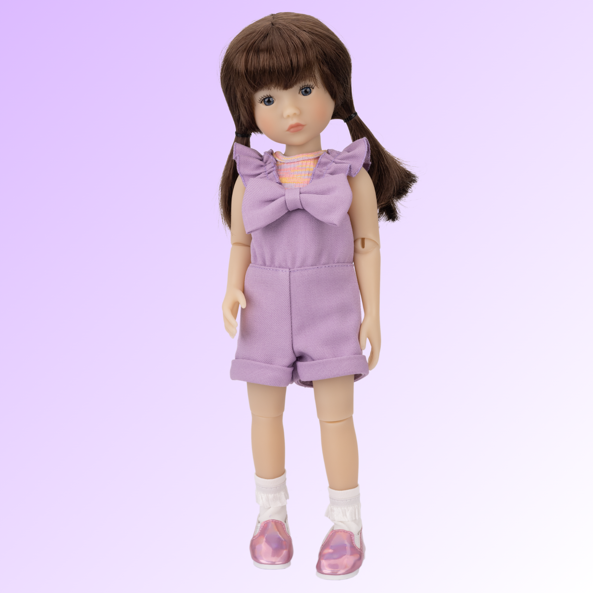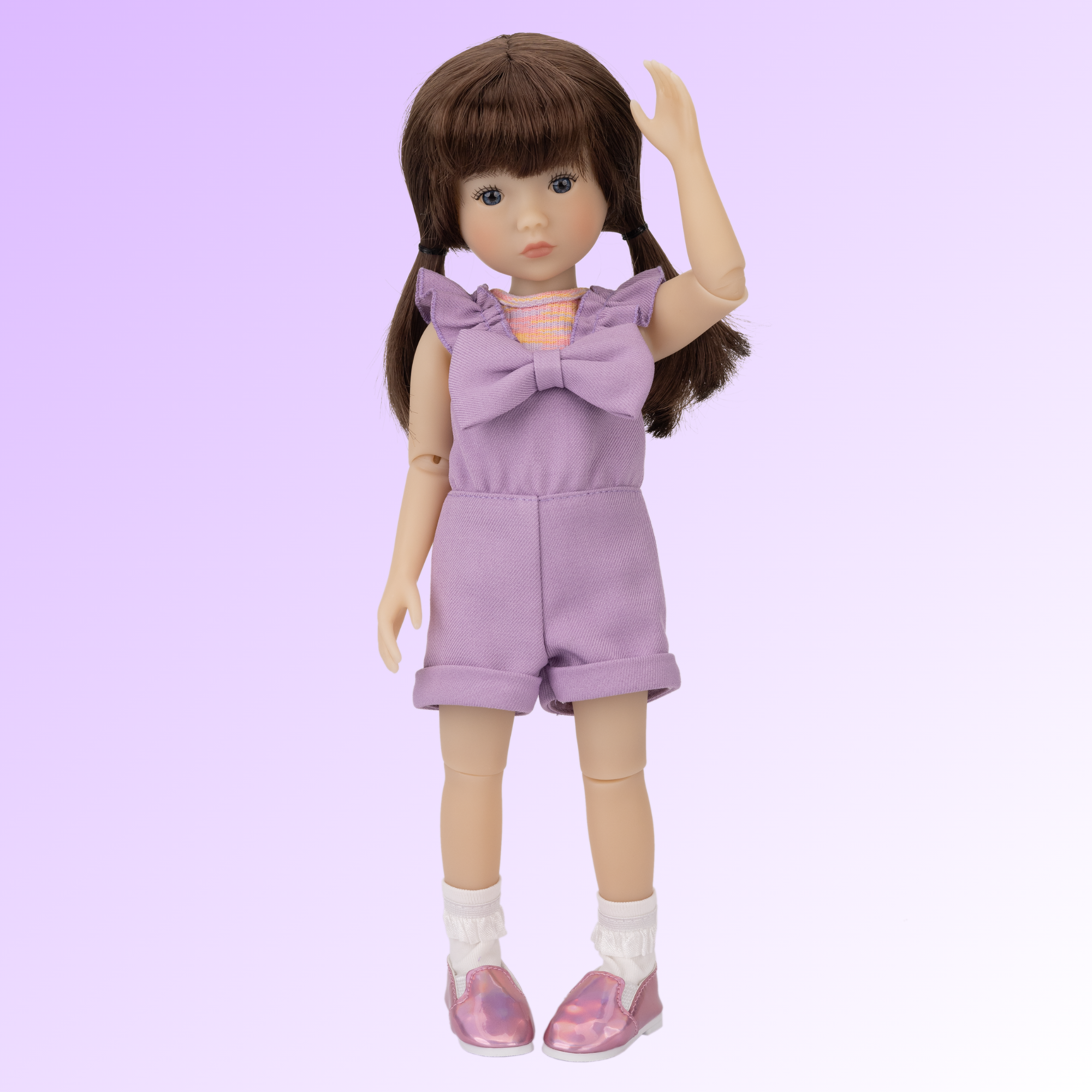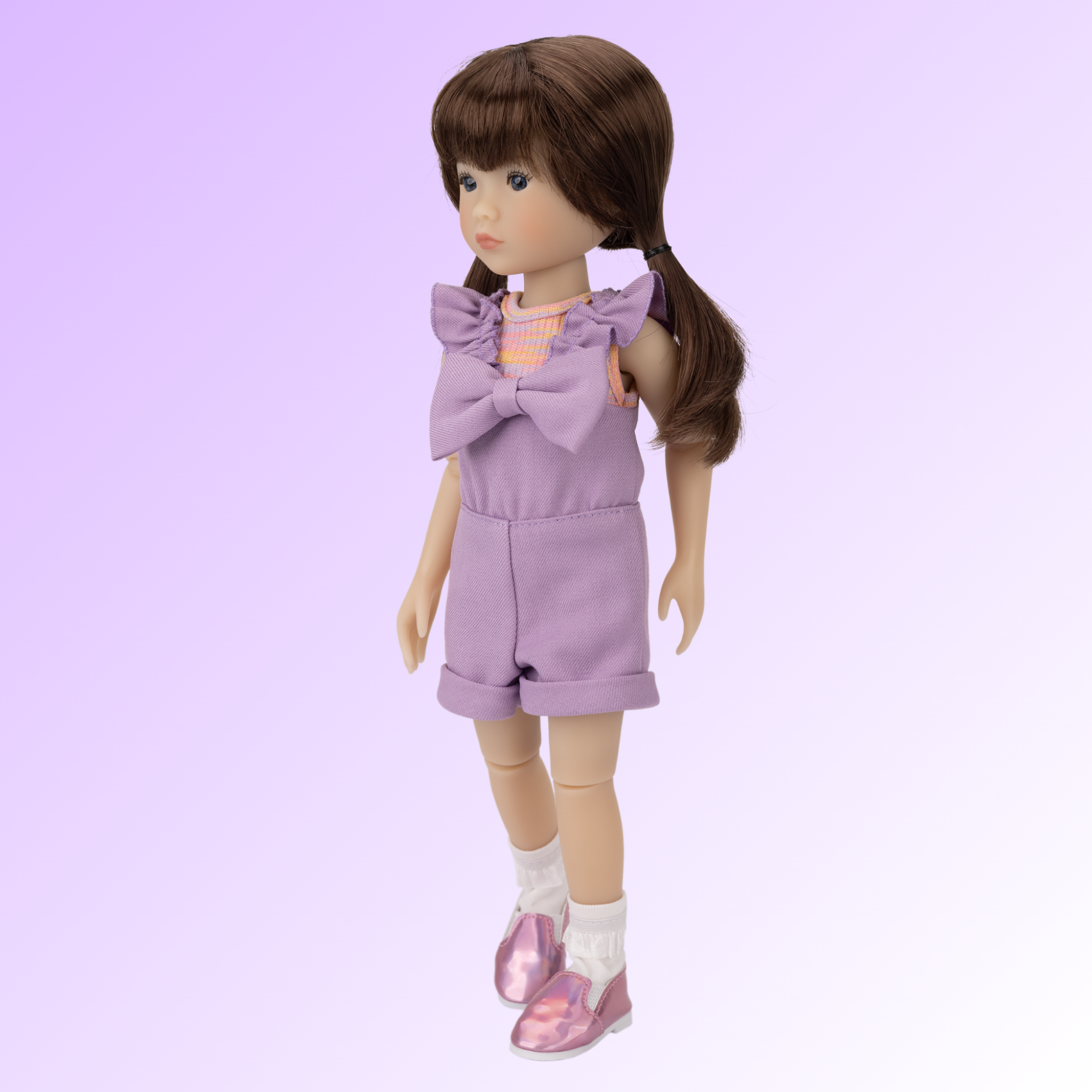 Tracy’s outfit is as whimsical as her artistic spirit! She’s wearing an adorable lavender romper with playful straps that feature delightful ruffled sleeve flounces. The shorts have rolled cuffs for an adorable touch, while a stunning purple bow takes center stage!