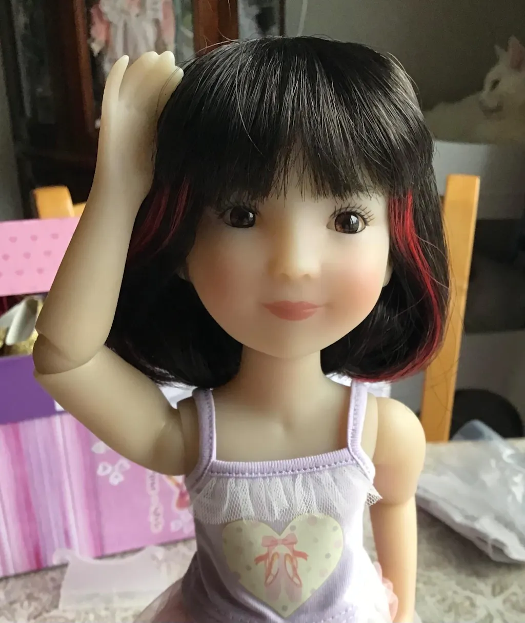Sydney has a dark bob hairstyle and comes dressed in a ballet camisole, a pink tutu, printed leggings. She has sparkly pink flats and a fancy ribbon headband.