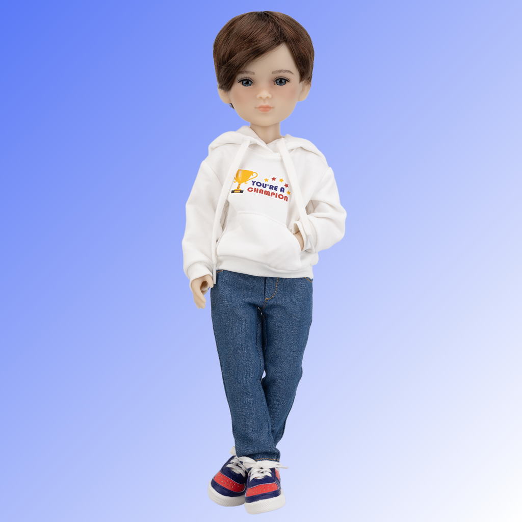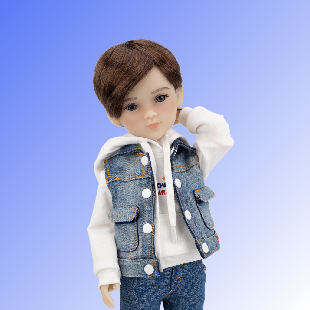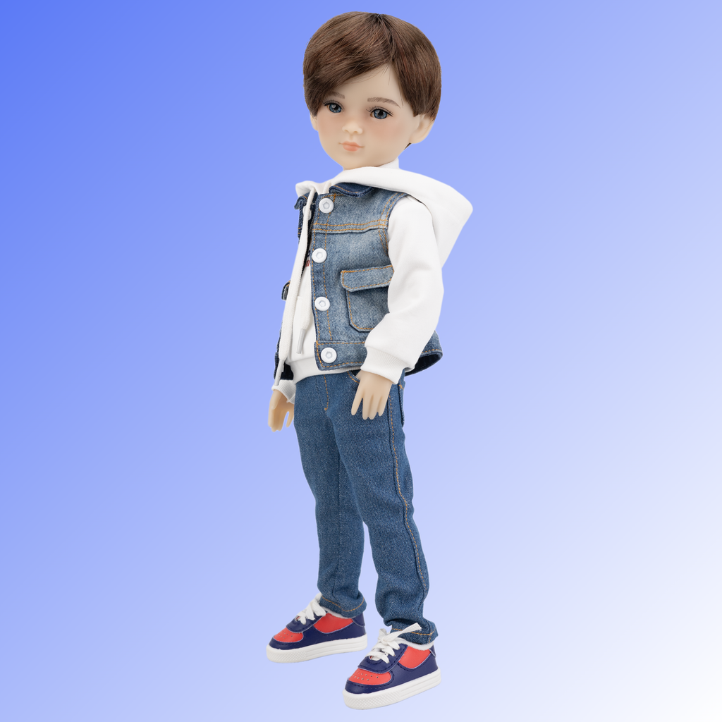 Thomas is dressed to impress in a trendy denim vest adorned with white buttons and two handy pockets. Beneath, he wears a cool white hoodie emblazoned with the inspiring phrase “YOU’RE A CHAMPION” and a cozy kangaroo pocket. His stylish jeans feature two front slash pockets and two back pockets, blending fashion and function. To top off his look, Thomas sports a pair of dark blue and red sneakers, which are perfect for all kinds of fun adventures!