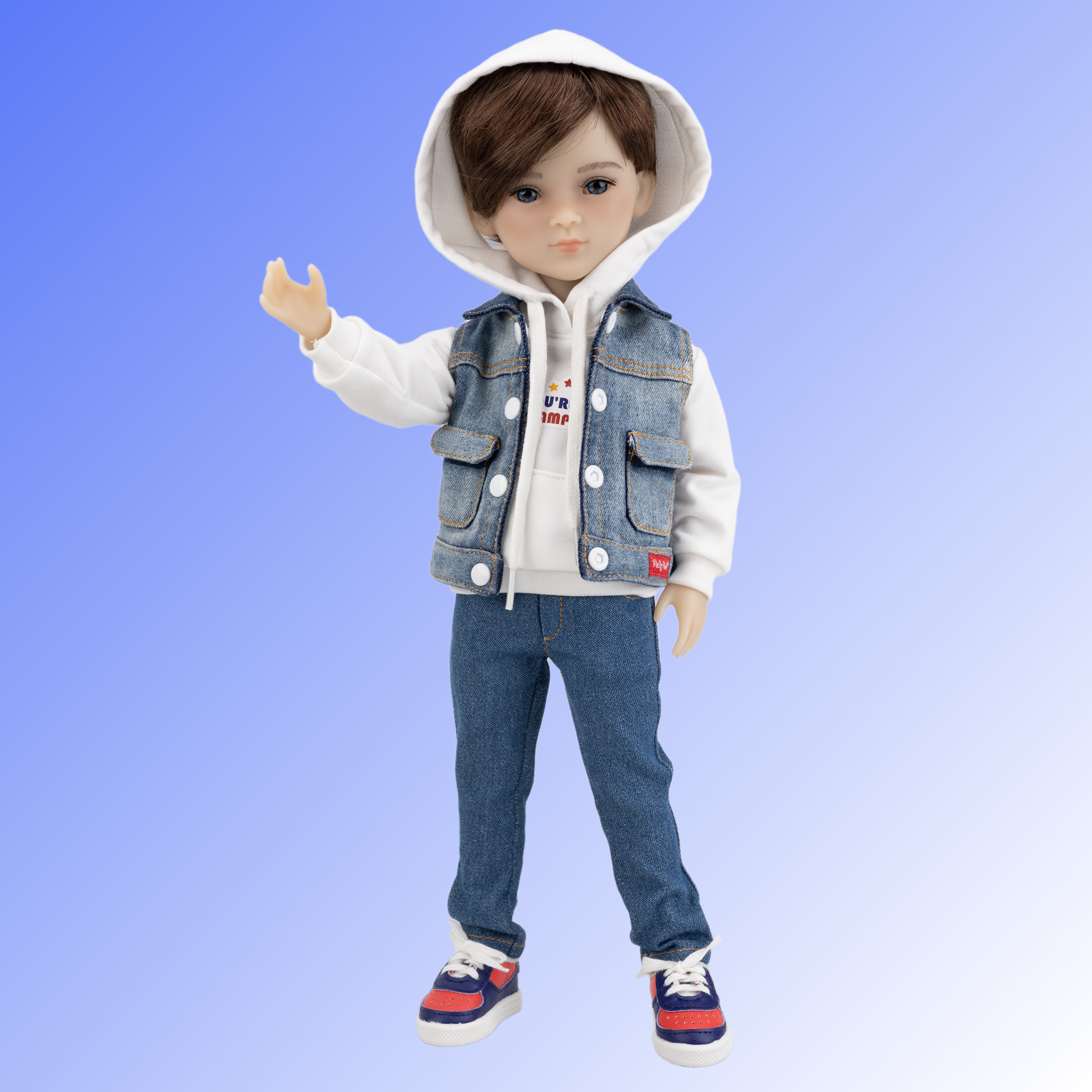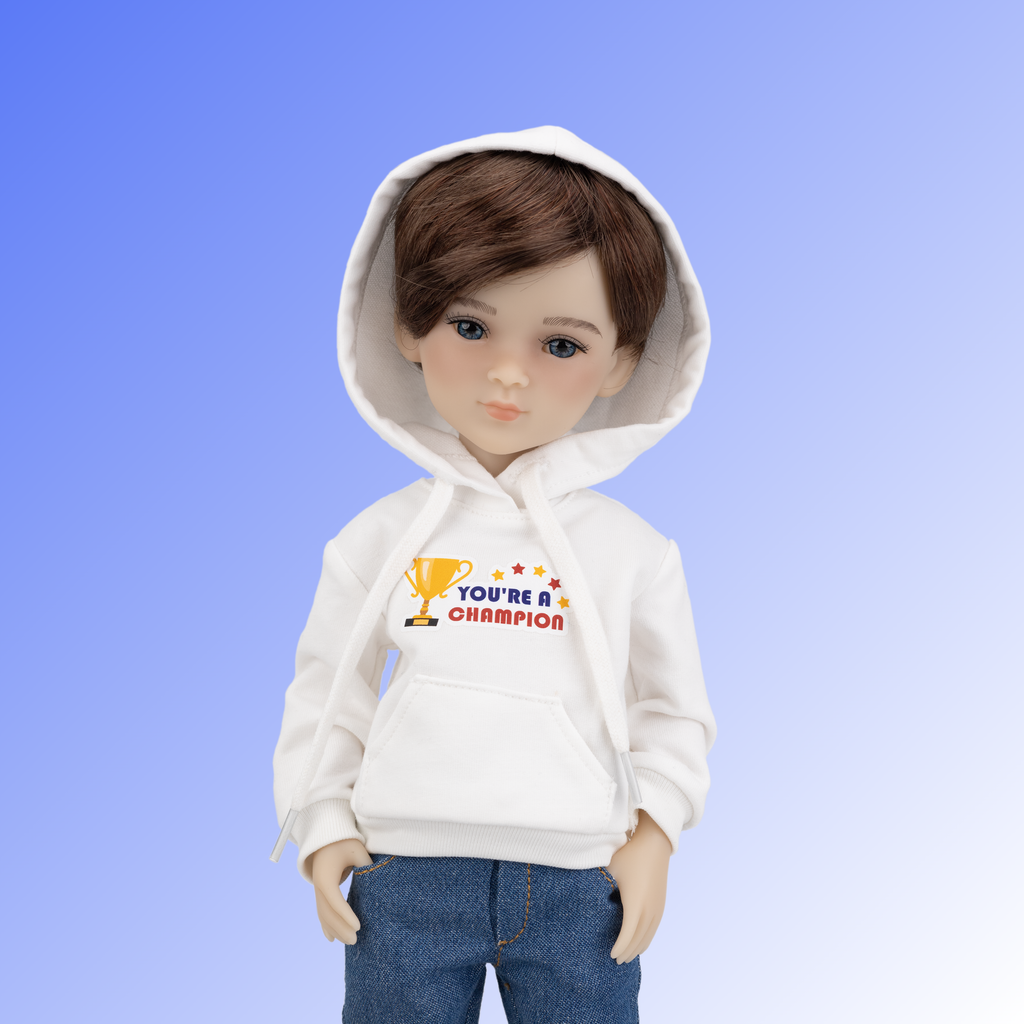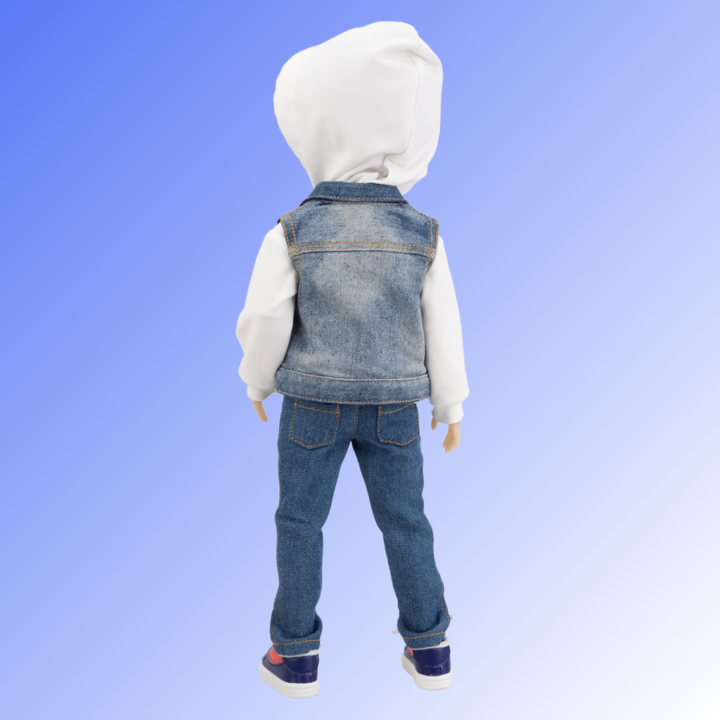 Thomas is dressed to impress in a trendy denim vest adorned with white buttons and two handy pockets. Beneath, he wears a cool white hoodie emblazoned with the inspiring phrase “YOU’RE A CHAMPION” and a cozy kangaroo pocket. His stylish jeans feature two front slash pockets and two back pockets, blending fashion and function. To top off his look, Thomas sports a pair of dark blue and red sneakers, which are perfect for all kinds of fun adventures!